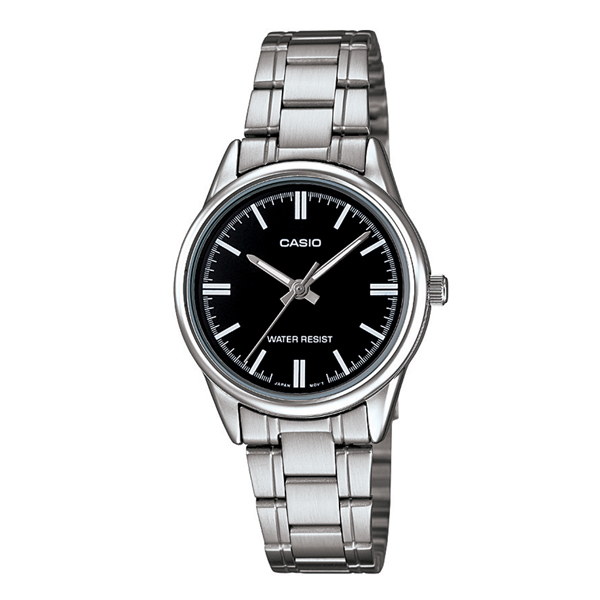 Casio LTP-V005D-1A silver stainless steel band & black analog dial women simple watch