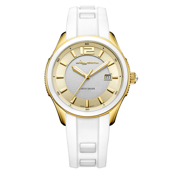 The Rhythm ES1402R04 is a stunning ladies’ analog gift watch with a golden dial and white soft silicon band, featuring Earth Saver technology for an eco-friendly yet stylish design.
